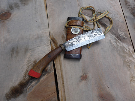 鈍い光を放つ年季の入った鉈は、速水さんのお父様が刀鍛冶の方に打たせたという一品。先端が四角い形をした腰鉈は、枝打ちや草払いなどさまざまな山仕事に欠かせない。移動の際は鉈を鞘に収め、付属の真田紐を腰に結わえて吊り下げる。