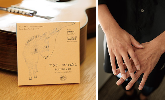 高名なギタリストの手をじっくり見たのは、これがはじめてだ。「プラテーロとわたし」は、大萩さんのセルフレーベル「MARCO CREATORS」の第一弾作品。メゾ・ソプラノ歌手波多野睦美さんの新訳による歌と朗読、そしてジャケットの表装は銅版画家山本容子さんによるものだ。