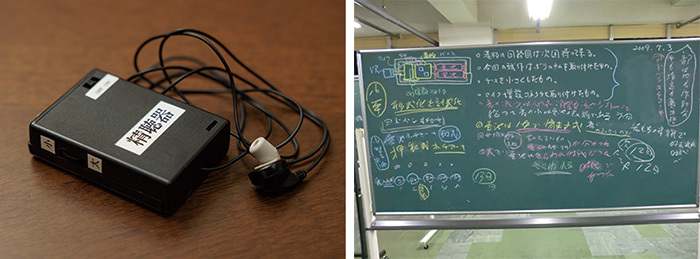 河合さんのお父さんは10年前、98歳6カ月で天寿を全うされた。晩年、自身の耳が悪くなったことから、96歳のときに最後に開発したのがこの補聴器。誰もが使えてハウリングがなく安価なものを目指し「これは補聴器ではなく“精聴器”だ」と言っていたという。生涯、開発研究を貫いたその姿勢は、黒板の設計メモに現れている。