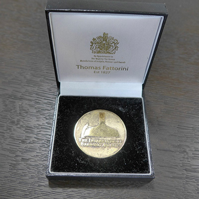 2017年、世界で最も歴史ある国際ビール審査会The International Brewing Awards(IBA)で、「伊勢角屋麦酒」が初めて金賞を受賞した際のメダル。鈴木さんも社員も、うれしくてうれしくて触り過ぎて金色が剥げて変色してしまった。同審査会においては19年、21年と連続して金賞を受賞。21年には金賞受賞の上位10%に授与される「トロフィーアワード」も獲得した。