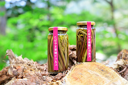 丹波山村でとれる野菜と山梨県産のワインパミス(ワインをつくるとき、ブドウを絞った後に残る果皮や種)を使った薬膳ピクルス。地元のおばあちゃんが手づくりする人気の特産品だ。