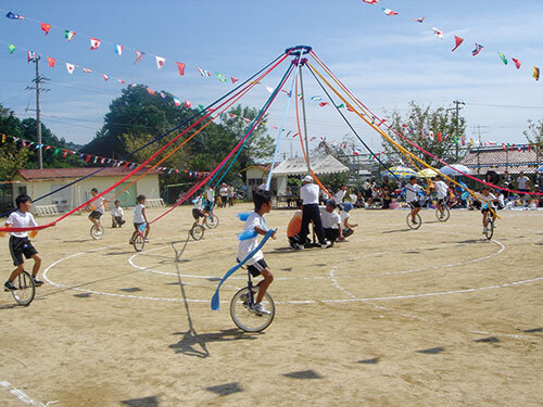 世古先生が校長として務めていた小学校の運動会の様子。子どもたちが見事な一輪車演技を披露した。先生が演技のシナリオを書き、職員一丸となって子どもたちと毎日練習したという。一輪車は1989年から3~4年生の体育に取り入れられ、先生は一般教諭の頃から、積極的に取り組んでこられたそうだ。