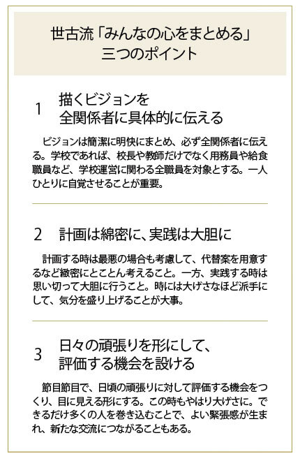 世古 教師の時もそうでしたが、節目節目で何かしらそういうことをやって、自分たちが頑張ったことに対する成果をかたちにしてあげないと、職員もついてきません。