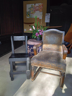 見るからにビンテージ感漂う2脚の椅子。向かって右側は、新宮先生のお祖父様が広島時代に書斎で使っておられた椅子で、100年以上前につくられたもの。左は先生のお父様が、ご家族一人一人に合わせて手作りされた椅子。65年が経つという。椅子はいずれも現役で、新宮家の玄関土間で静かに来客を迎えている。