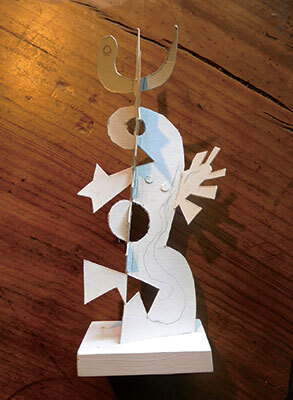 藤田さんが現在制作を依頼されている、縄文人のスピリットが込められたモニュメントの模型。これは厚紙製の小さなものだが、実物は木製で、高さ1間(約180センチ)くらいになるということだ。だから、縄文人としてはだいぶ大柄なものとなる。それを想像すると、どんなものになるのか、でき上がりが楽しみになってくる。