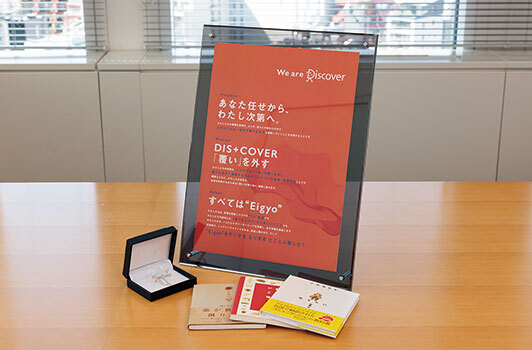 ディスカヴァー・トゥエンティワン発行の書籍。谷口さんが入社前に読んで感銘を受けた本も含まれている。伊藤氏の著作は、優しそうな雰囲気なのにピリッとした内容とのこと。そして、社長就任時に伊藤氏からプレゼントされたブローチは、前にしか飛ばないトンボをかたどったものだ。経営者としてのあるべき姿勢を示唆されたのかもしれない。