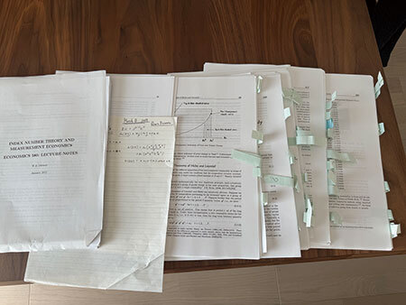人生の転機となった宝物だと清水氏が語るのは、ブリティッシュコロンビア大学時代に恩師となったErwin W. Diewert氏が著した「レクチャーノート」。難しいことで有名な分厚い教材だが、清水氏はそこに数式の間違いを頻繁に見つけては講義のたびに指摘し続けた。Diewert氏からは「30年間、信頼して使ってきた教材なのに、間違いを指摘してきたのは君だけだよ」と、あきれとも称賛とも取れるため息が聞こえたそうだ。