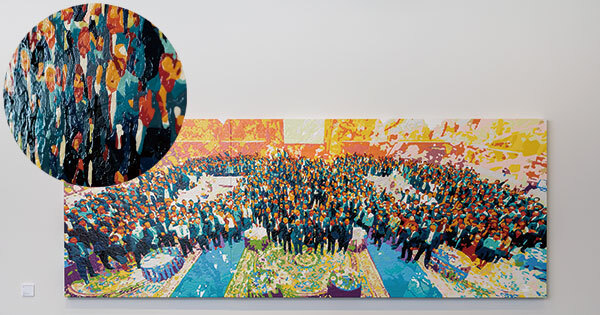 2025年に50周年を迎えたバッファローだが、これは10年前の40周年記念式典の集合写真をもとに、現代アーティスト近藤大祐氏にコミッション制作を依頼したアート作品。写真のままだと複製が可能だが、一品もののアート作品は複製することができない。つまり、唯一無二の歴史として、後世に残すことができるのだ。