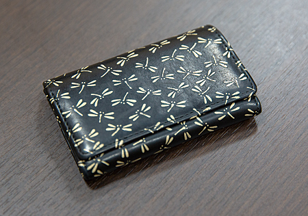 社会人になった時、銀座の大野屋で購入した印伝の名刺入れ。柄のトンボは「不退転」の精神を表すとして勝ち虫とも呼ばれ、戦国武将にも好まれた。購入後、すっかり印伝のファンとなり、お財布、ベルトなど多くの印伝を所持しているとか。