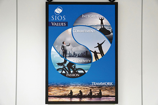 SIOS Valuesは、Passion(情熱)、Creativity(創造)、Commitment(約束)、Integrity(誠実)、Teamwork(チームワーク)の5つ。 執務室や会議室にこのポスターを掲げて、喜多社長自身を含め、全社員で共有している。この規範を実践に移して、優れた業績を示した社員・チームを表彰する報奨プログラムも行っているということだ。