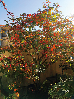 ベランダの主役を占める位大きくなり、春の若葉、初夏の白い花、夏の収穫、晩秋の真紅の紅葉、と一年を通して楽しませてくれます。最近では、家内のピアノの生徒さんも、夏の収穫を楽しみにしています。