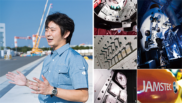 目の前には東京湾の海が広がる。心が広々して、深呼吸したくなる。隣接する埠頭では日産自動車のクルマの船積みが行われている。対岸に目をやると、遠くに軍艦が見える。横須賀の米海軍基地に停泊する船だ。海洋研究開発機構は、目前は海という環境にある。施設の埠頭には幾つかのコンテナが整然と並んでいる。中身は何かと思ったら、海中探査機だそうだ。撮影のために探査機の内部に入った。すると奥のほうに一升瓶が置いてある。一瞬、見てはいけないものを見たのかしらと思いきや、「調査するにあたって、お酒は重要なコミュニケーションツールなんですよ」。海中ロボットを操作するのは中谷さんだが、船の操舵は船員の皆さんだ。「クルーの皆さんとの意思疎通が調査内容を左右する」というわけだ。