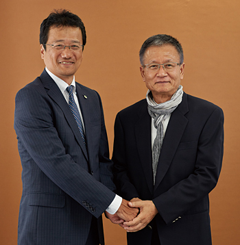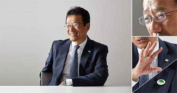 もう40年も前の、記者になりたての頃、日立の社章は“亀の子マーク”と覚えた。このマークは軽いものから重いものに至るまでの日立製品の刻印となっていた。緑色の「この木なんの木……」の社章はエコキャンペーンのバッジみたいで日立の企業イメージが何だか“かる・く”なったような気がした。阿部さんとの出会いは新しい社章になってからだ。このバッジをつけた阿部さんと最初にお目にかかったときのことだ。政府関係の“環境大使”のようだ、と思った。「こぼれ話」の欄に掲載したこれまでの写真を見ていただくと、私の背が対談相手の方によって、低くなったり高くなったりする。身長170cmを基準にしてご覧いただくと、阿部さんは推定180cmとなる。学生時代にレガッタの選手だったという発言に続いて、「だから私はコックス(会社)の指示に従って、ただただ漕ぐだけですよ」と、顔をクシャクシャにしての笑顔。この必殺技は万国に通用する。日立という会社をツールにして、日本の強みを世界に伝えていっていただきたい。