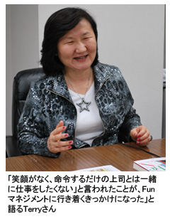 Jinsoo Terry(ジンソー・テリー)さんとは、韓国のとても親しい友人の紹介で面談することになった。会ってみると、大変な苦労人であり、笑顔の美しい人だった。FUNマネジメント理論については、アメリカの大学教授のなかにも「MBAを超える」と評価する人が現れているという。来年、英語版が出版されれば、新たな旋風を巻き起こすことになりそうだ。【取材:2008年6月9日、BCN本社にて】