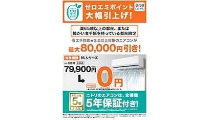 最大8万円引き! ニトリの省エネエアコンが65歳以上ならゼロエミ対象でお得