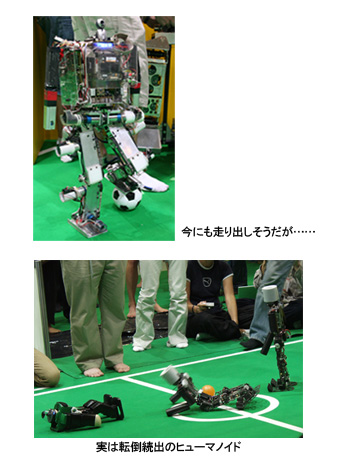 ロボカップでは2足歩行のヒューマノイドリーグの人気が高い。鉄腕アトムのイメージもありメディアの注目度もNO1だ。しかしロボットが2足歩行するという難しさが理解できたとしても、ヒューマノイドリーグを見てサッカーを「楽しむ」という気持ちになるには、人並み外れた広い心と豊かな想像力が必要だ。現在のヒューマノイドロボットは、ゆっくりと歩くことがやっと。今大会で初の試みとなった2対2のゴールキック対戦でも、ほんの1m先のボールを見つけて蹴るまでに何分もかかり、ボールを蹴るどころか倒れて前にすら進めないロボットが続出。試合ともなれば、ロボットが入り乱れて走り回るというイメージからはほど遠いのが現状だ。