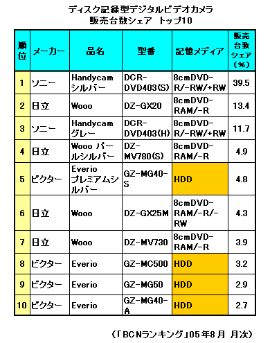 さらに、こうしたディスク記録型のうち、大半は8cmDVDメディアに記録するタイプと12cmDVDメディアに記録するタイプだ。これらの販売台数シェアは合わせて82.9%。その残り、17.1%がHDD記録タイプ、ということになる。現在HDD記録タイプを販売しているのはビクター1社だけ。逆に考えれば、わずか1社でこれだけの販売シェアをとっている、ともとれる数字だ。