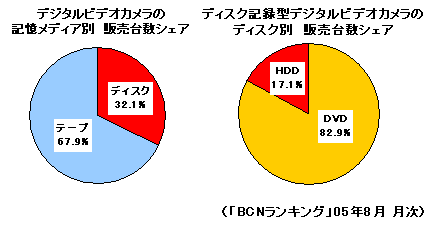 ビデオカメラはテープで撮るもの、なんとなくそんな先入観がある人も多いだろう。DVD・HDDレコーダーが普及期を迎えている昨今だが、まだビデオカメラまで巻き込んだ現象にはなっていないからなのかもしれない。しかし、直近8月の「BCNランキングデータ」データで集計すると、HDDとDVDのディスクを記録メディアに使うカメラの販売台数シェアは、実に32.1%。思いのほか売れているようだ。