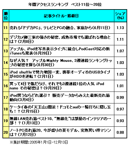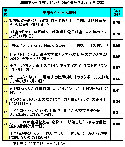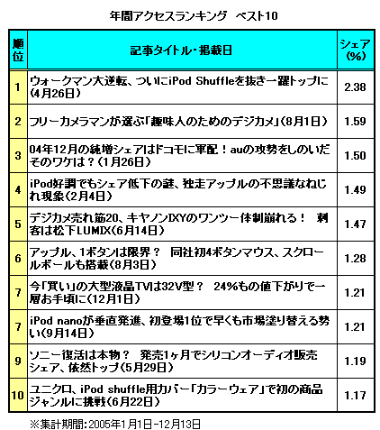 こうした熾烈な戦いを反映してか、記事ランキング上位20の中だけでもiPodの関連記事は約半数の9件を占め、アクセスシェアでもなんと11.53%を記録した。携帯オーディオ、とりわけiPodがいかにホットな年であったかかがよくわかる。シェア1.17%でランキング10位につけた「ユニクロ、iPod shuffle用カバー「カラーウェア」で初の商品ジャンルに挑戦」では、あのユニクロまでもiPodのアクセサリ市場に参入するという加熱ぶりを伝えた。