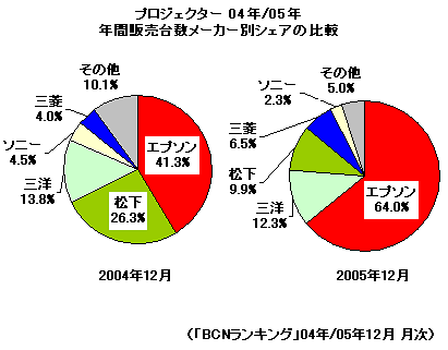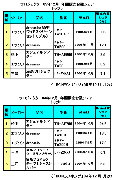 05年の秋以降、プロジェクター市場で圧倒的な販売台数シェアを獲得したのが、エプソンの「EMP-TWD1」だった。1年前の04年は松下の「TH-AE700」がシェア約24%で1位、それをエプソンの「EMP-TW10H」「EMP-TW200H」の2機種が追うかたちとなっていた。それに対して05年、エプソンの「EMP-TWD1」が33.9%のシェアを占めて1位を獲得。さらにメーカー別の販売台数シェアで見てみると、04年12月は1位のエプソンが41.3%、2位の松下が26.3%。ところが05年12月のエプソンのシェアは64%。このユニークな新製品の登場が、シェアを2割以上も押し上げる大きな原動力となったのだ。