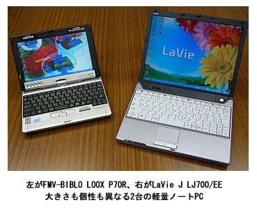 ――2台レビュー 富士通「FMV-BIBLO LOOX P70R」とNEC「LaVie J LJ700/EE」<br /><br /> 常日頃「持ち運んで使う」用途なら、ノートPCは軽いほどいい。今のところ売れ筋は相変わらず3kg超の廉価マシンだが、ここにきて各社とも1kg前後の軽量PCを相次いで投入しはじめ、ノートPCに新たな軽量化の流れが見え始めた。そこで、特に軽いノートPCの売れ筋動向を見ながら、最新軽量マシンの代表格として1月に富士通とNECが発売した2機種をレビュー、これからの軽量ノート