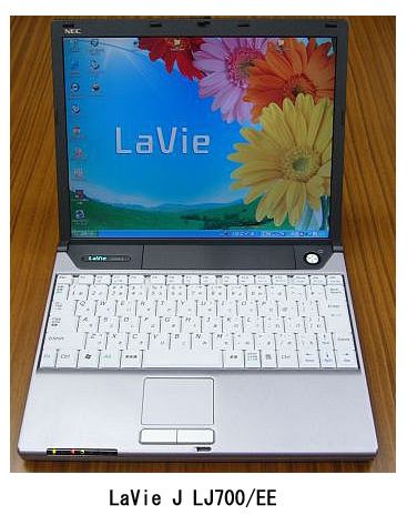 一方1月6日に発売されたのが、NECファン待望の超軽量パソコン「LaVie J LJ700/EE」。12.1インチの大画面液晶を搭載しながら、1066gという軽さが最大の特徴だ。実際に手にとってみると拍子抜けするほど軽い。しかし、天板に凸凹つけて、いわゆるボンネット構造とすることで、耐加圧150kgfという高い堅牢性を確保している。ボディにはマグネシウム合金を採用。さらにHDD周辺をラバーで保護し、落下や外部からの衝撃からドライブを守る。
