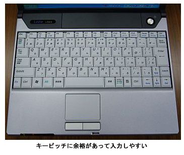 A4サイズに近いやや大きめのボディだが、その分画面も大きくキーボードも余裕の17.55mmピッチでタイプしやすい。さらに、底面にアルミフレームを使用することでノートパソコンとは思えないほど軽快なフィーリングで入力できる。また、HDDは超軽量PCでよく使用されている1.8インチタイプではなく、2.5インチのものを搭載。そのため、80GBと比較的大きなディスクが搭載可能になった。CPUは「Pentium超低電圧版753」を採用することに加え、電源効率のよい液晶インバータの採用、マザーボードに搭載されているデバイスの共通化など、徹底した省電力設計。標準バッテリーでも6時間の長駆動時間の駆動できる点も実用性が高い。