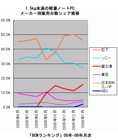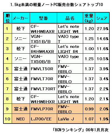 軽量ノートPCをどう定義するかは難しいところだが、ここでは、日常的に持ち歩いてもさほど苦にならない1.5kg未満のマシンを軽量ノートPCと定義する。これに当てはまるノートPCを1月のBCNランキングで集計してみると、ノートPC全体のわずか4.7%だった。ところがこの軽量ノートPCが、徐々にではあるが拡大しそうな状況なのだ。売れ筋の3kg前後の重量級ノートPCが激しい価格競争の波にさらされているなか、「持ち歩きに最適化」されたノートPCなら付加価値が高く、まだ価格以外の部分でも十分競争が成り立ち「うまみ」があるからだ。