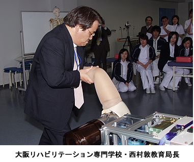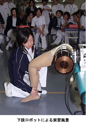 人間の脚の関節を再現するリハビリテーション・トレーニングロボットが登場した。実際のリハビリ教育機関でこのロボットを使った授業を公開、理学療法士育成の大きなツールとなることを実証するとともに、ロボット産業におけるひとつのビジネスモデルも提示した。公開授業は2月22日、大阪市の大阪リハビリテーション専門学校で、同校の理学療法士コース3年生24名を対象に行われた。主催は大阪市の次世代ロボット産業振興機関のロボットラボラトリーと大阪市。プロジェクト参画組織・企業のほか、理学療法教育機関の関係者や日刊紙記者らが招