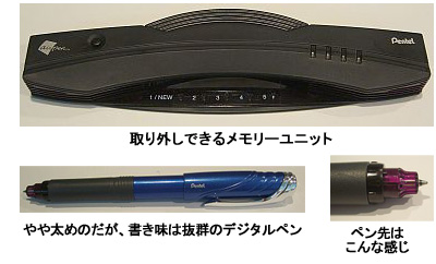 文字を書いていくと、専用ボールペンのペン先から発せられる超音波(音波)と、赤外線(光)をメモリユニットが受信し、到達速度の差からペンの動きを解析・再現して、デジタルデータとして記録していく仕組み。そのため、特殊な紙を使う必要がない。同梱されているメモ帳以外の普通の用紙でも読み取り可能で、ランニングコストも安く抑えられる。