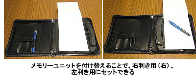 メモリユニットと呼ばれるメモの内容を読み取るための装置と、A5サイズのメモ用紙、専用のボールペンがセットになっていて、一式をコンパクトな専用ケースに収めて気軽に持ち歩けるようにできている。メモリユニットはケースから外して利用することも可能で、専用ケースを含めた全体の本体の重量は、わずか730g。モバイル性は高い。