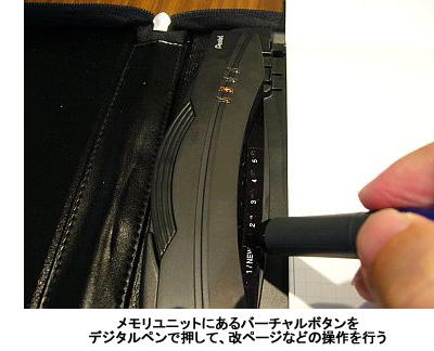 「airpen」の動作モードには、PCとUSBケーブルで直接つないで操作する「PC接続モード」と、パソコンには接続せずに電池から電源供給を受けて動作する「モバイルモード」の2種類が用意されている。特に、モバイルモードで利用する場合、電源ボタンを3秒押すだけで利用可能な状態になるので、会議や打ち合わせの進行に素早く対応できるのがうれしい。また、ページの切り替えは、「バーチャルボタン」と呼ばれるボタンを1秒間押すだけでOKだ。内蔵メモリにはA5サイズで約100枚分のデータが保存可能なため、実用上、まったく問題はないだろう。