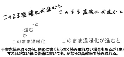 肝心の文字認識能力だが、思った以上に精度が高いことに驚かされた。また、一般のOCRソフトのようにマス目にちまちまと文字を書いていく必要はなく、普通に書いた文字を変換してくれるのは気分がいい。細かい文字や難しい漢字などもほとんど正確に変換される。所々に変換ミスや改行ミスが見られるが、テキストエディタのように画面上で随時、修正が行えるので、メモの内容すべてを最初から入力することを考えれば、作業効率は段違いに高い。