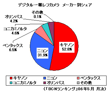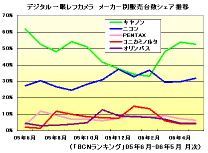 国内のデジタル一眼レフ市場ではキヤノンとニコンの2社が圧倒的なシェアを占めている。BCNランキング05-06年月次販売台数シェアの推移では、キヤノンは一時シェアを落としたものの、直近の5月月次データでは52.8%と市場の半分、ニコンも30%以上のシェアを獲得しており、2強による寡占状態が続いている。