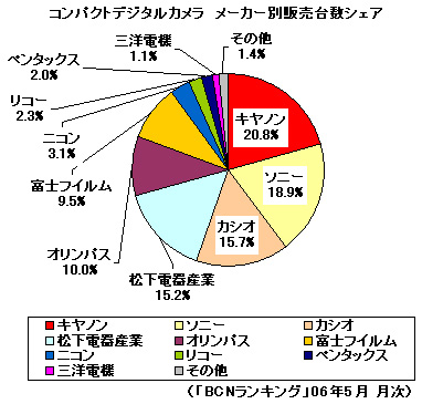 一方でソニーが一眼レフ市場で成功する可能性も少なからずある。一眼レフ市場は新規となるソニーだが、複数メーカーによる競争が激しいコンパクトデジタルカメラ市場では「サイバーショット」ブランドで一定のポジションを確立。BCNランキングの06年5月のコンパクトデジタルカメラメーカー別シェアでは18.9%と1位のキヤノンとの差が1.9%にまで迫っている。