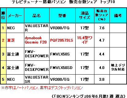 ランキング1位は、NECの液晶一体型デスクトップPC「VR300/FG」。2位には東芝のノートPC「PQF20573LS」が、昨年12月発売の旧モデルながら、06年夏の後継モデルを抑えてランクイン。3位と4位には、富士通の液晶一体型デスクトップPC「PCFMVLX50S」と、デジタルチューナー搭載の上位モデル「FMVLX50SD」が僅差で続いた。