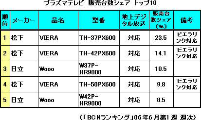 直近ランキングでは4月発売の松下のVIERA(ビエラ)37V型「TH-37PX600」が販売台数シェア23.5%で1位を獲得した。5月第1週(5月1日-5月7日)にトップを獲得し、以降5週連続で首位を走っている。2位は、シェア14.1%で同じ松下の「PX600」シリーズの42V型がランクインした。「プラズマテレビは松下というブランドイメージが強い」(同)のも理由のようだ。