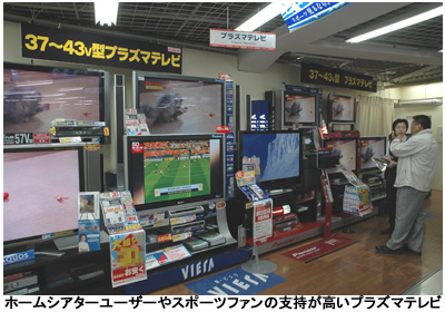 スポーツなど動きの速い番組に適しているといわれるプラズマテレビは、サッカー観戦にはもってこい。W杯直前の駆け込み需要も期待できそうだ。ある量販店では「プラズマテレビの購買層は映像にこだわるホームシアターユーザーとスポーツファンがメイン」という。店頭でもプラズマテレビの特徴である「黒の表現力」「応答速度の速さ」が評価されているようだ。
