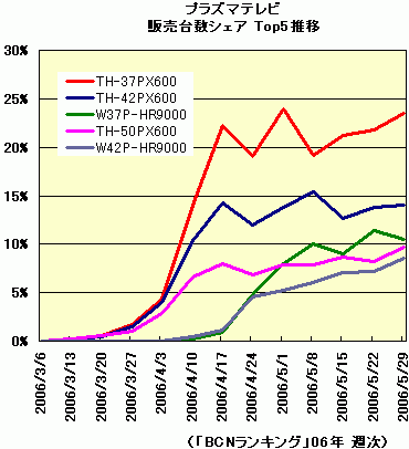 販売台数トップ5のシェア推移を見ると、松下の「TH-37PX600」が4月以降、垂直に立ち上がったほか、37V型、42V型他の新製品もそれぞれ順調に立ち上がり、トップ5は全て新製品に入れ替わった。