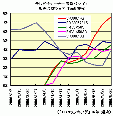 「VR300/FG」は、AV機能を重視した液晶一体型PC「VALUESTAR R」シリーズのエントリーモデル。OSにWindows XP Media Ceter Edition 2005を採用し、リモコン操作で音楽や映像を簡単に楽しめる。また、高画質アナログTVチューナーを搭載し、地上アナログ放送の視聴と録画に対応する。4月の発売以降、ほぼ右肩上がりでシェアを伸ばし、5月第3週(06年5月15日-21日)にテレビ機能付きパソコンで1位を獲得した。直近の販売台数シェアは7.6%と、5%未満の2位以下を大きく引き離している。