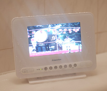 防水タイプのテレビは他社からも発売されているが、チューナー一体型のものが多い。ところが、バスルームではテレビ電波を安定的に受信できず、映像が乱れて見るに堪えないケースが多かった。液晶画面も3インチ程度と小さい機種がほとんどだ。「PTV-WWTV7」はチューナー部を独立させ、アンテナケーブル経由で受信したテレビ放送をデジタル圧縮して、無線でモニタ本体に送信しているため、映像はほとんど乱れない。また、同様の方式をとるワイヤレステレビもあるが、無線規格に電波干渉を受けやすいIEEE802.11gを採用していたり、価格が10万円前後するものだったりして、手を出すのがためらわれる。市場実売価格で5万円を切る「PTV-WWTV7」は、価格面でも魅力的な製品といえるだろう。プリンストンテクノロジーによると、予想以上の人気で現在品薄状態らしい。プチセレブ気分に浸りながらバスルームでテレビを見る??そんな楽しみ方に目覚めたのは、どうやら筆者だけではないようだ。(フリーライター・中村光宏)