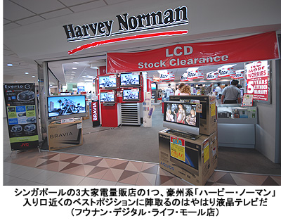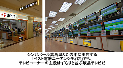 ちなみに、ニー・アン・シティのシンガポール高島屋S.C.内に出店する日系の量販店「ベスト電器」で、テレビの販売動向を聞いてみたところ、やはり主流は液晶を中心とした薄型だという。実際テレビの展示スペースのほとんどを液晶テレビが占めていた。主流のサイズは32型から40型へシフトつつあるということで、大型化も徐々に進んでいるようだ。