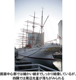 「EOS 5D」の画質にはまったく不満はないが、ただ、35mmフルサイズCMOSセンサーは、レンズ性能に対する要求がシビアなようだ。安価なレンズだと画面の四隅で、光量不足や解像力不足が露呈してしまう。今回試用したレンズは普及価格帯の標準ズームレンズ「EF28-105mm F4-5.6USM」だったが、周辺部では明らかに光量不足や画像の流れが見られた。「EOS 5D」の撮影では、レンズもある程度レベルの高いものを用意する必要がありそうだ。キヤノンの交換レンズEFシリーズの中でも、とくに高画質レンズであることを示す、レンズ鏡胴部に赤いラインが入った「Lタイプ」が、「EOS 5D」にはぴったりだと思う。