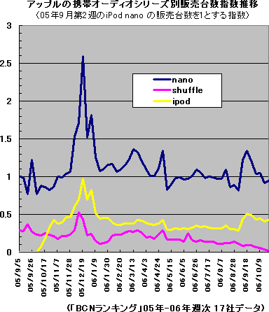しかし、販売台数の伸びは今ひとつだ。05年9月第2週(9月5日-11日)でのnanoの販売台数を1とした販売台数指数の推移を見ると、台数の伸びは4月あたりで止まって足踏み状態。9月の新nano投入後も、一時持ち直したがまた以前の水準に戻っている。第5世代iPodもマイナーチェンジ版が粘りを見せてはいるものの、突き抜けるような勢いはない。間もなく第2世代が発売されるiPod shuffleにいたっては、ずっとジリ貧状態が続いていた。