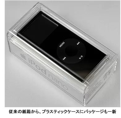 ボディーといえば、パッケージも大きく変更された。これまでの紙箱から、透明なプラスチックケースになり、iTunesなどが収められたCD-ROMもなくなった。競泳用水中メガネのパッケージにそっくりだが、本体のnanoをはずすのに苦労するかもしれない。よく見れば、はずし方が図式で描かれている。また、同梱のイヤホンも変わった。従来品と同じテイストの色・デザインを踏襲しつつ、やや小ぶりになって、凹凸の少ない滑らかな形状に変更された。