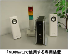 2社が提供する企業向けの緊急地震情報配信サービス「MJ@lert(エム・ジェイ・アラート)」は配信システムから企業などに設置した専用の受信・警報装置「緊急箱」に地震発生の情報を知らせる。「緊急箱」は、配信システムから設置された地域へ揺れの「到達までの余裕時間」と「予想震度」の速報を受信し、予め設定した震度を超えた場合に、付属の警告灯とスピーカーで警報を発する。