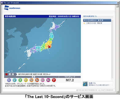 気象庁の「緊急地震速報」は、日本全国に1000台設置した地震計を使って、地震発生直後に震源に近い地震計で捉えた観測データを解析し、震源地や地震の規模(マグニチュード)を即座に推定、情報を発信するサービス。各地点で最も強い地震波が到達する時刻や震度を推定し速報するため、揺れる直前に「まもなく地震が来る」という情報を得ることができるのが特徴。配信は気象業務支援センターが行っている。情報は有料で月額約5万円。