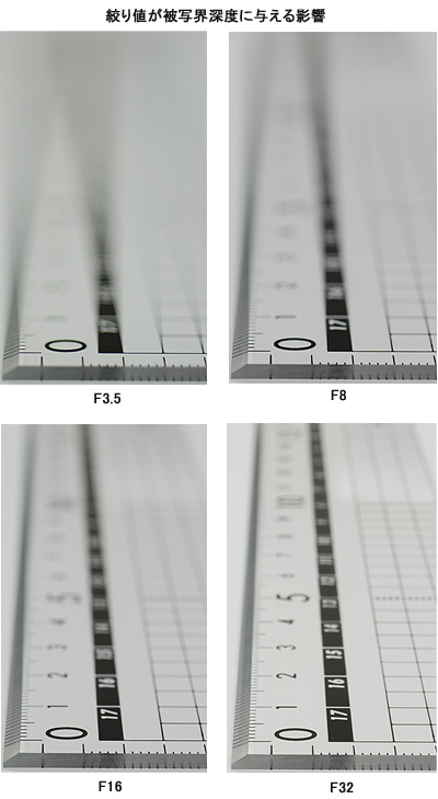 絞りは明るさを調節するだけではなく、被写界深度もコントロールすることができる。絞りを開けると被写界深度は浅くなり、ピントの合う範囲はきわめて狭くなる。逆に絞り込むと、被写界深度は深くなり、ピントの合う範囲が広くなる。実際の例は、絞り値を変えながら物差しを撮った写真で確認していただきたい。