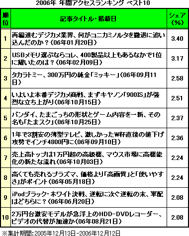 デジタル一眼と薄型テレビがブレイクした06年。デジタル製品全体にとっても1つの転換期ではなかっただろうか? 今年のトレンドを人気記事のアクセスランキングで示す「WebBCNランキング・ランキング」を見ながら、1年を振り返る。なおアクセス件数シェアは上位100位の総アクセス数に占める割合で計算した。