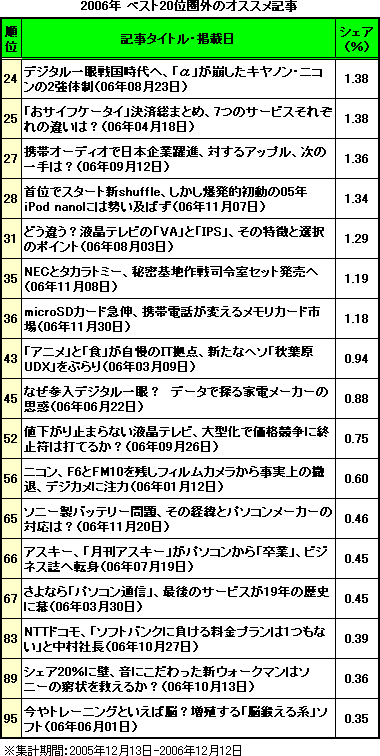 決済機能を持った携帯電話、いわゆる「おサイフケータイ」も一気に広まった。乱立する各社のサービスをまとめた[「おサイフケータイ」決済総まとめ、7つのサービスそれぞれの違いは?(06年04月18日)]は、25位で1.38%のアクセスを集めた。携帯電話での大きなトピックスは、やはりナンバーポータビリティ(MNP)の開始。0.39%で83位[NTTドコモ、「ソフトバンクに負ける料金プランは1つもない」と中村社長(06年10月27日)]など、ソフトバンクの戦略に関しては、さまざまな物議を醸した。他方、年内に予定されていたWindowsの新バージョン「Vista」の登場が07年1月にずれ込んだこともあり、パソコン関連の記事は低迷した。最も読まれた記事は[今買うVista対応PC、お得なアップグレードのチェックポイントは?(06年11月15日)]だったが、1.37%で26位にとどまった。また、0.46%で65位だった[ソニー製バッテリー問題、その経緯とパソコンメーカーの対応は?(06年11月20日)]でまとめた、ノートパソコンのバッテリー問題も起こり、パソコンは全般的に苦戦を強いられた。